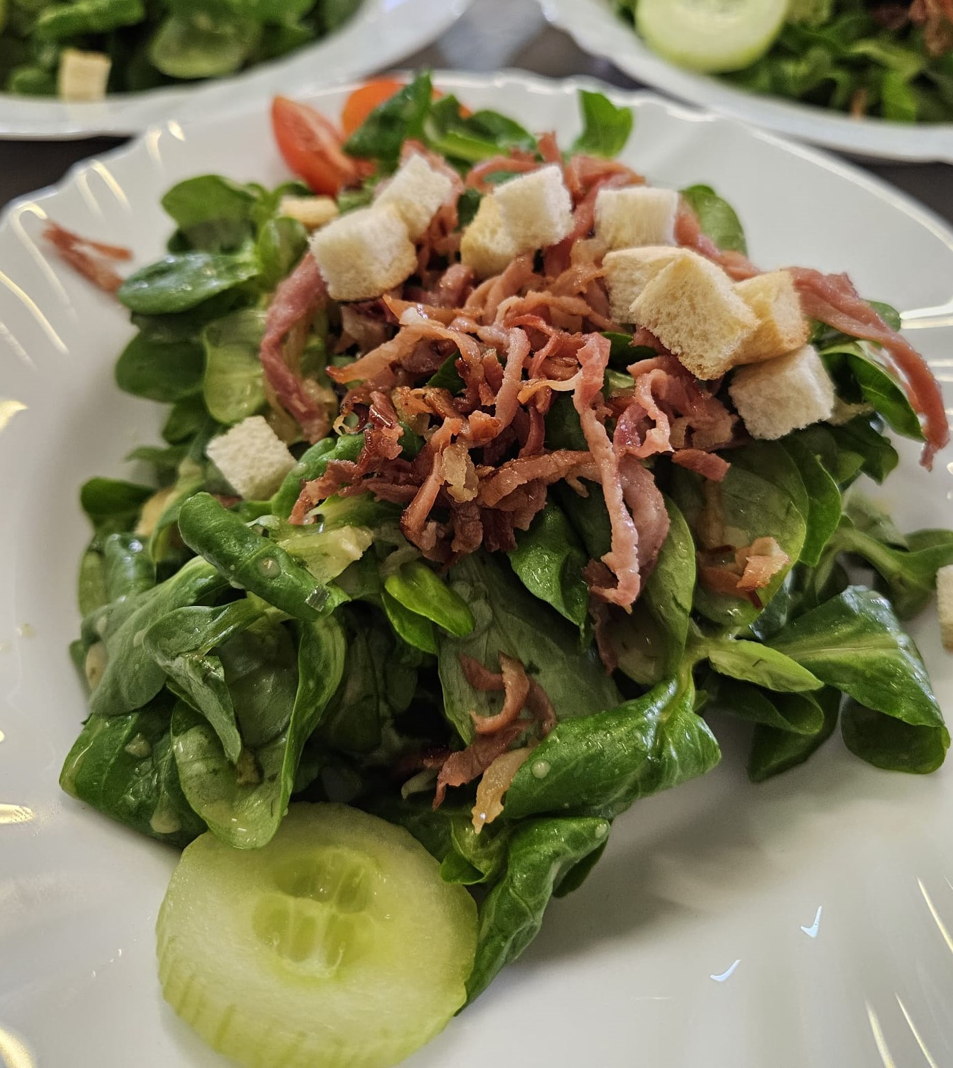 - Feldsalat – Kartoffeldressing – Speck – Kracherle – Baguette (Saison)
