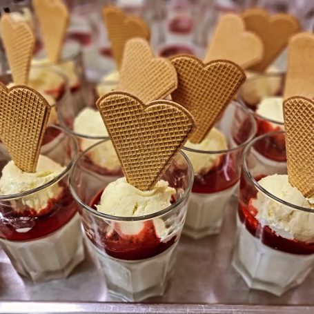 - Hausgemachte Sauerrahm Panna Cotta – Himbeersauce – Vanilleeis im Glas - Gebäck